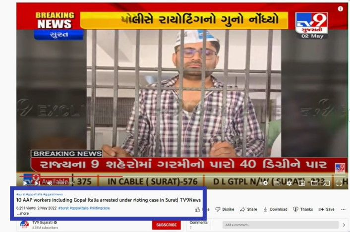 “Italia Surat Arrest” કીવર્ડ સર્ચ કરતા સાથે TV9 ગુજરાતી દ્વારા 2 મે 2022ના રોજનો પોસ્ટ કરવામાં આવેલ યુટ્યુબ વિડિયો જોવા મળે છે. વીડિયોમાં લગભગ 20 સેકન્ડ પછી ગોપાલ ઈટાલિયાનો જેલના સળિયા પાછળ ઉભેલ વાયરલ તસ્વીર જોઈ શકાય છે.