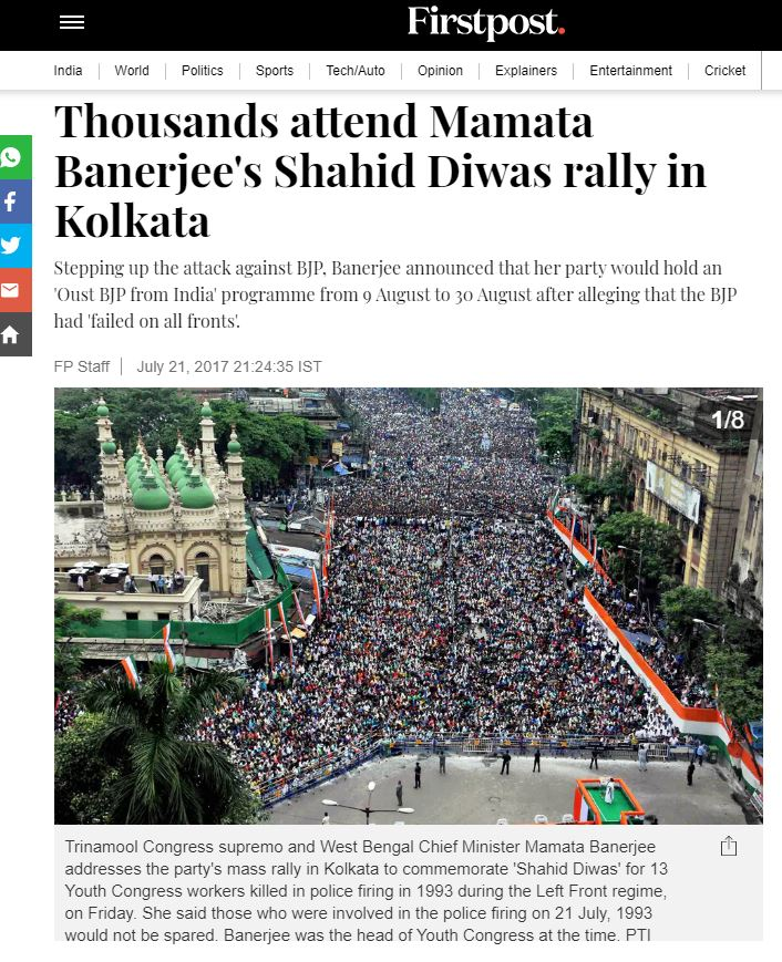 તપાસ દરમિયાન, અમને 21 મે, 2017ના રોજ મીડિયા વેબસાઈટ ફર્સ્ટપોસ્ટ પર પ્રકાશિત અહેવાલમાં વાયરલ તસ્વીર જોવા મળે છે. અહેવાલ મુજબ, પશ્ચિમ બંગાળના મુખ્ય પ્રધાન મમતા બેનર્જીએ 1993માં પોલીસ ગોળીબારમાં માર્યા ગયેલા 13 યુવા TMC કાર્યકરોની યાદમાં ‘શહીદ દિવસ’ નિમિત્તે કોલકાતામાં પાર્ટીની જાહેર રેલીને સંબોધિત કરી હતી.