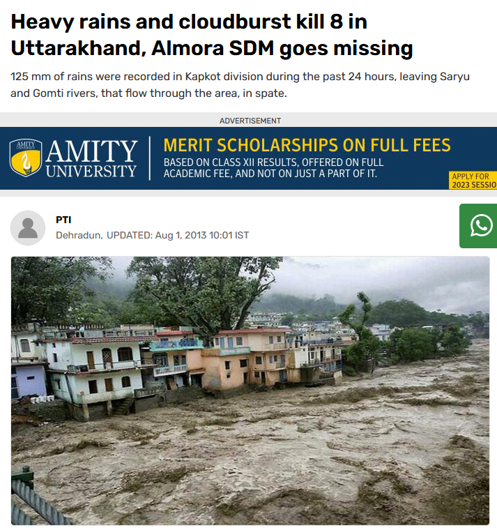 આ તસ્વીર સાથે મળતી માહિતી મુજબ, ઓગષ્ટ 2013માં કપકોટ વિભાગમાં છેલ્લા 24 કલાક દરમિયાન 125 મીમી વરસાદ નોંધાયો હતો, જેના કારણે આ વિસ્તારમાંથી વહેતી સરયુ અને ગોમતી નદીઓ વહેતી થઈ હતી.