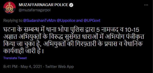 આ ઘટના સંદર્ભે મુઝફ્ફર નગર પોલીસ દ્વારા પણ ટ્વીટર મારફતે જાણકારી આપવામાં આવેલ છે કે ભોપા પોલીસ સ્ટેશન દ્વારા ઘટના સંબધિત 5 વ્યક્તિના નામ સાથે અને અન્ય 10-15 અજાણ્યા લોકો પર IPC ધારા મુજબ ફરિયાદ નોંધીને ધરપકડની કાર્યવાહી હાથ ધરેલ છે.