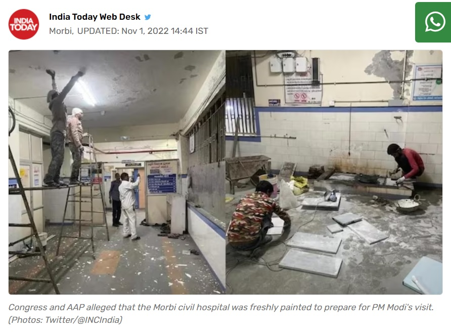 અહેવાલ અનુસાર, ગુજરાતના મોરબીમાં પુલ તૂટી પડવાની ઘટનામાં 100થી વધુ લોકોના મોત થયા હતા. આ અકસ્માતમાં સારવાર લઈ રહેલા લોકોની મુલાકાતે આવેલા વડાપ્રધાન મોદી માટે મોરબી સિવિલ હોસ્પિટલને રંગ રોગાન સહિતના કામો કરવામાં આવ્યા હતા જે બાદ વિવાદ સર્જાયો હતો. કોંગ્રેસ અને આમ આદમી પાર્ટી સહિતની પાર્ટીઓએ આ ઘટના પર ભાજપ સરકાર પર આરોપ લગાવ્યા હતા.
