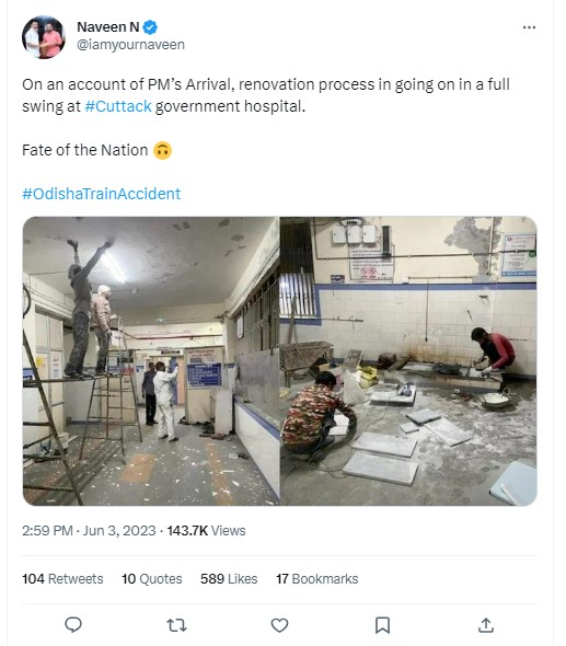 ઓડિશામાં બનેલ ટ્રેન દુર્ઘટનાને લઈને વડા પ્રધાન મોદીની મુલાકાત માટે ઓડિશાની કટક હોસ્પિટલને રિનોવેટ કરવામાં આવી રહી હોવાની તસ્વીરો સોશિયલ મીડિયા પર વાયરલ થઈ રહી છે.