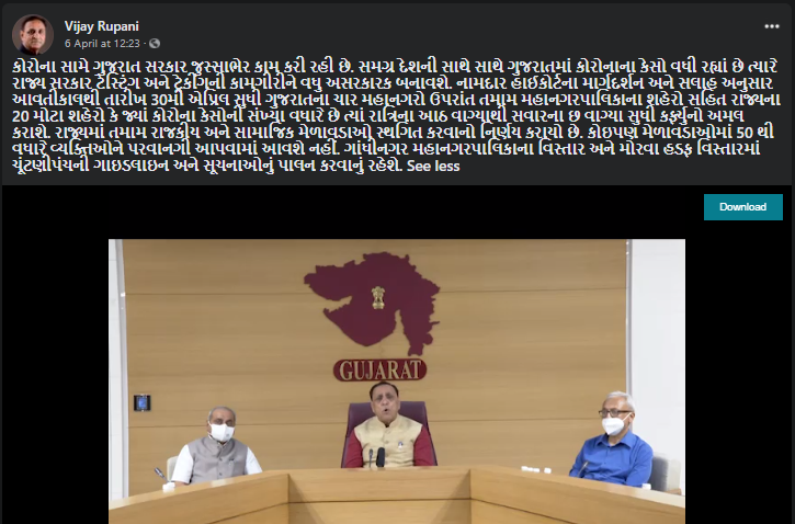ગુજરાતમાં વધી રહેલા Corona કેસ અંગે સરકાર દ્વારા કરવામાં આવેલ કામગીરી અને આયોજનો અંગે મુખ્યમંત્રી દ્વારા લાઈવ કોન્ફરન્સ મારફતે કરવામાં જાહેરાતો અહીંયા તેમના ફેસબુક એકાઉન્ટ પર જોઈ શકાય છે. જેમાં આગામી દિવસોમાં Lockdown લાગુ કરવા અંગે કોઈપણ માહિતી આપવામાં આવેલ નથી.