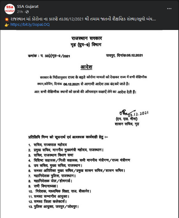 આ તમામ ઘટના સાથે જોડાયેલ રાજસ્થાન સરકારનો એક આદેશ સોશિયલ મીડિયા પર શેર કરવામાં આવ્યો છે. જેમાં દાવો કરવામાં આવ્યો છે કે, રાજસ્થાનમાં ઓમિક્રોનના વધતા જતા કેસોને ધ્યાનમાં રાખીને તમામ શૈક્ષણિક સંસ્થાઓ 6 ડિસેમ્બરથી આગામી આદેશ સુધી બંધ રહેશે. ઉલ્લેખનીય છે કે અગાઉ આ જ દાવો છત્તીસગઢના નામે પણ શેર કરવામાં આવ્યો હતો. જે સંદર્ભે newschecker દ્વારા ફેકચરેક રિપોર્ટ પ્રકાશિત કરવામાં આવેલ છે.