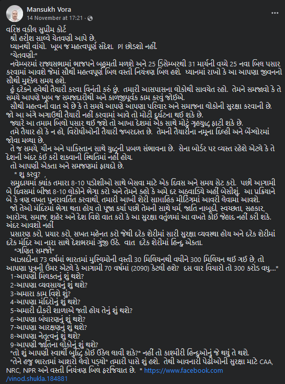 ફેસબુક યુઝર્સ દ્વારા શેર કરવામાં આવી રહેલા દાવાઓમાં લખવામાં આવ્યું છે કે “વરિષ્ઠ વકીલ સુપ્રીમ કોર્ટ શ્રી હરીશ સાલ્વે ચેતવણી આપે છે. નવેમ્બરમાં રાજ્યસભામાં ભાજપને બહુમતી મળશે અને 25 ડિસેમ્બરથી 31 માર્ચની વચ્ચે 25 નવા બિલ પસાર કરવામાં આવશે જેમાં સૌથી મહત્વપૂર્ણ બિલ વસ્તી નિયંત્રણ બિલ હશે. આઝાદીના 73 વર્ષમાં ભારતમાં મુસ્લિમોની વસ્તી 30 મિલિયનથી વધીને 300 મિલિયન થઈ ગઈ છે, તો આપણા પુત્રની ઉંમર એટલે કે આગામી 70 વર્ષમાં (2090) કેટલી હશે? તેથી આવનારી પેઢીઓની સુરક્ષા માટે CAA, NRC, NPR અને વસ્તી નિયંત્રણ બિલ ફરજિયાત છે.”