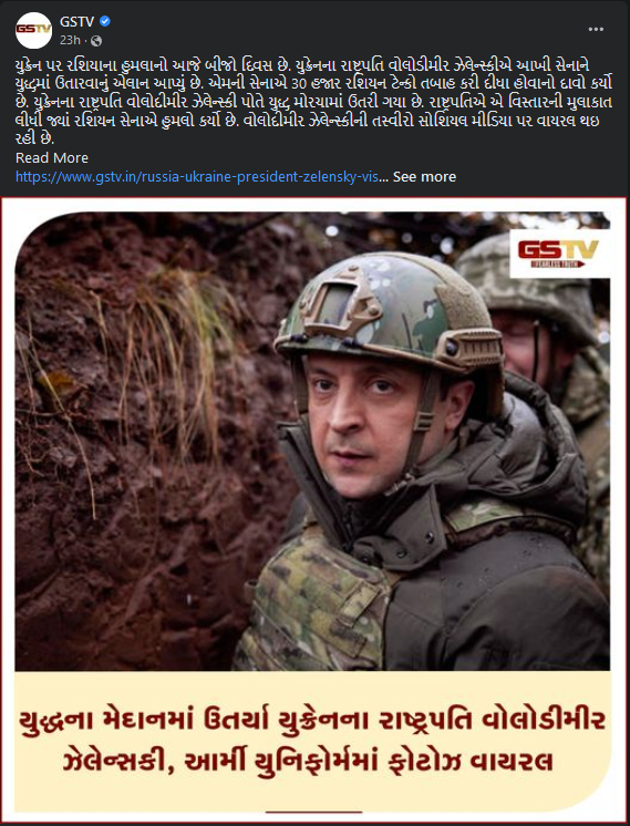 તેમજ, ન્યુઝ સંસ્થાન GSTV દ્વારા 25 ફેબ્રુઆરીના “યુદ્ધના મેદાનમાં ઉતર્યા યુક્રેનના રાષ્ટ્રપતિ વોલોડીમીર ઝેલેન્સકી, આર્મીના યુનિફોર્મમાં ફોટો થઇ વાયરલ” હેડલાઈ સાથે એક અહેવાલ પ્રકાશિત કરવામાં આવેલ છે.