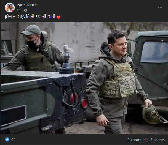 ફેસબુક યુઝર્સ દ્વારા “યુક્રેન ના રાષ્ટ્રપતિ ની 56″ ની છાતી” ટાઇટલ સાથે રાષ્ટ્રપતિ વોલોદીમીર ઝેલેન્સ્કીની કેટલીક તસ્વીર શેર કરવામાં આવેલ છે.