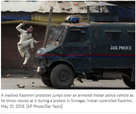 અહેવાલ અનુસાર, કાશ્મીરના શ્રીનગરમાં એક વિરોધ પ્રદર્શન દરમિયાન માસ્ક પહેરેલ એક કાશ્મીરી ભારતીય, પોલીસ વાહન પર કૂદકો મારીને તેના પર પથ્થરમારો કરે છે. નોંધનીય છે કે, આ તસ્વીર 31 મે, 2019 ના રોજ ન્યુઝ એજન્સી APના ફોટોગ્રાફર દાર યાસીન દ્વારા લેવામાં આવેલ છે.