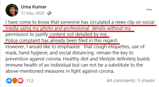 इसके बाद हमें डॉक्टर उमा कुमार द्वारा शेयर किये गए उपरोक्त फेसबुक पोस्ट से संबंधित एक लेख भी प्राप्त हुआ। जिसमें डॉक्टर उमा कुमार द्वारा उनके नाम पर झूठी जानकारी शेयर करने के लिए उनके द्वारा पुलिस में शिकायत की जानकारी दी गई है.