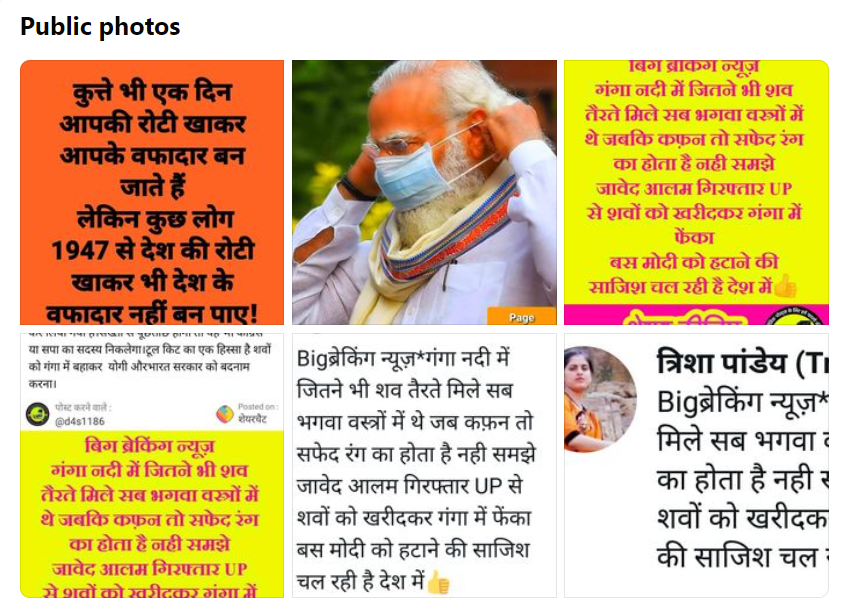 सोशल मीडिया पर गंगा नदी में तैरते शवों को लेकर दावा किया गया कि सभी शव भगवा वस्त्र में लपेटे गए थे, जिन्हें प्रधानमंत्री मोदी को बदनाम करने के लिए जावेद आलम नामक एक मुस्लिम युवक ने खरीदकर गंगा में बहाया था.