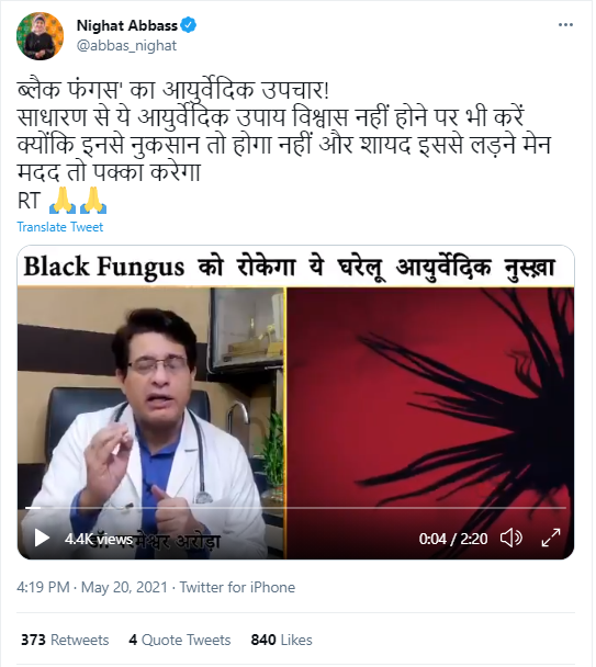 ट्विटर खंगालने पर हमें 24 मई, 2021 को PIB Fact Check द्वारा किया गया एक ट्वीट मिला। इसके मुताबिक सोशल मीडिया पर ब्लैक फंगस को लेकर किया जा रहा दावा फर्ज़ी है। इस नुस्खे से ब्लैक फंगस के उपचार का कोई वैज्ञानिक प्रमाण नहीं है।