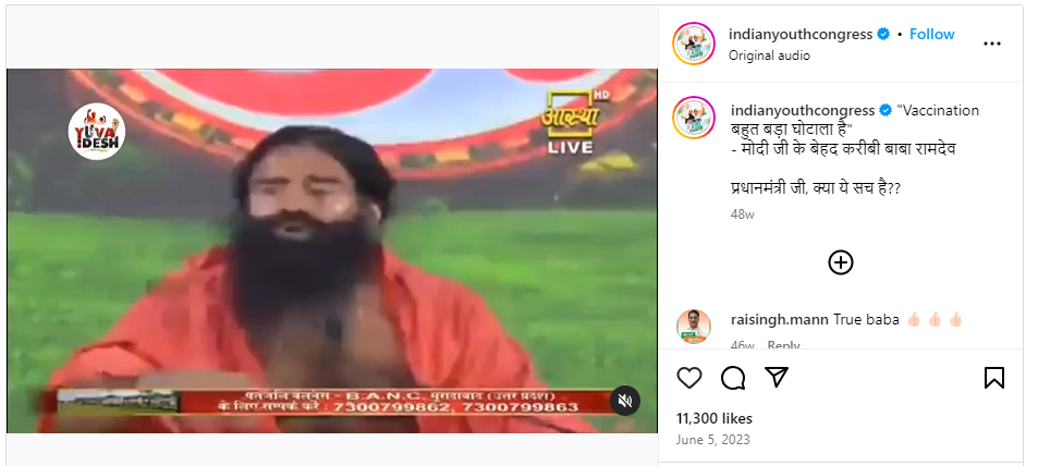 दावे की पड़ताल के लिए सबसे पहले हमने ‘कोरोना वैक्सीन पर बाबा रामदेव का बयान’ की-वर्ड को सर्च किया। परिणाम में हमें 5 जून 2023 को इंडियन नेशनल यूथ कांग्रेस के आधिकारिक इंस्टाग्राम अकाउंट द्वारा शेयर किया गया यह वीडियो मिला, जिसके कैप्शन में लिखा गया था – “Vaccination बहुत बड़ा घोटाला है” – मोदी जी के बेहद करीबी बाबा रामदेव। प्रधानमंत्री जी, क्या ये सच है??’ वीडियो में बाबा रामदेव कोरोना वैक्सीनेशन को बहुत बड़ा घोटाला कहते नज़र आ रहे हैं। इस वीडियो क्लिप के साथ जून 2023 में कांग्रेस के सोशल मीडिया हैंडल्स ने प्रधानमंत्री मोदी पर जमकर निशाना साधा था। वीडियो के साथ शेयर की गई कुछ अन्य पोस्ट्स को यहाँ, यहाँ और यहाँ देखा जा सकता है।