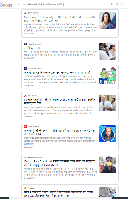 10 सेकेंड सांस रोककर कोरोना टेस्ट करने वाले दावे की सत्यता जानने के लिए हमने पड़ताल शुरू की। Google Keywords Search की मदद से खंगालने पर हमें वायरल दावे से संबंधित कोई मीडिया रिपोर्ट नहीं मिली।