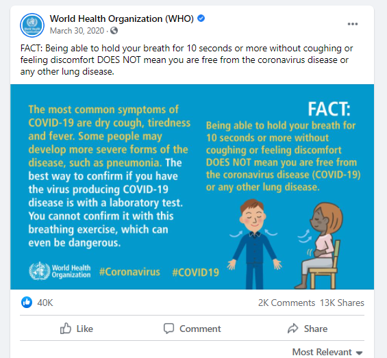 पड़ताल के दौरान हमें World Health Organization के आधिकारिक फेसबुक पेज पर 30 मार्च, 2020 को की गई एक पोस्ट मिली। इस पोस्ट के मुताबिक डब्लूएचओ (WHO) ने पिछले साल ही इस दावे का खंडन कर दिया था। केवल सांस रोकने से किसी भी व्यक्ति में कोरोना संक्रमण और फेफड़ों की कोई बीमारी है या नहीं इसका पता नहीं लगाया जा सकता है। आरटीपासीआर परीक्षण कोरोना वायरस के लक्षण दिखने पर किया जाता है। लेकिन यह कहना काफी भ्रामक है कि कोरोना की जांच 10 सेकेंड सांस रोककर की जा सकती है।