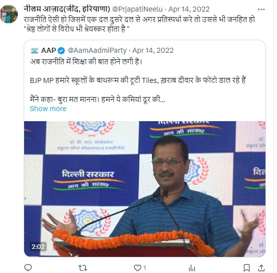 खोजने पर यह भी पता चला कि नीलम ने आम आदमी पार्टी के ट्वीट्स को भी रिट्वीट किया है।