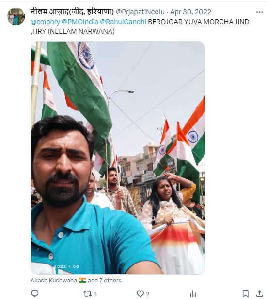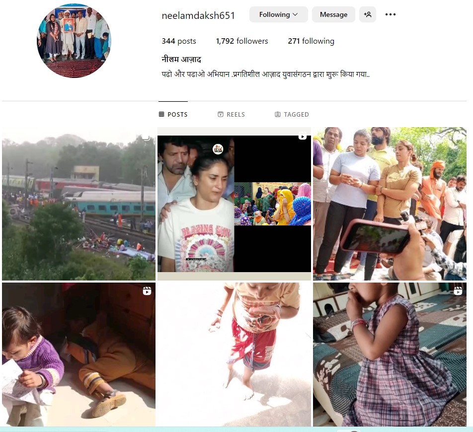 हमने भी इस दौरान नीलम के सोशल मीडिया अकाउंट, जैसे इंस्टाग्राम, फ़ेसबुक और ट्विटर अकाउंट को खंगाला, तो हमने पाया कि वह इन अकाउंट्स पर साल 2022 से ही सक्रिय हुई है. वह इन सभी अकाउंट्स पर खुद को नीलम आजाद निवासी जींद, हरियाणा बताती हैं. इसके अलावा, वह खुद को हरियाणा के जींद इलाके में सक्रिय स्थानीय संगठन प्रगतिशील आजाद युवा संगठन का सदस्य बताती है.