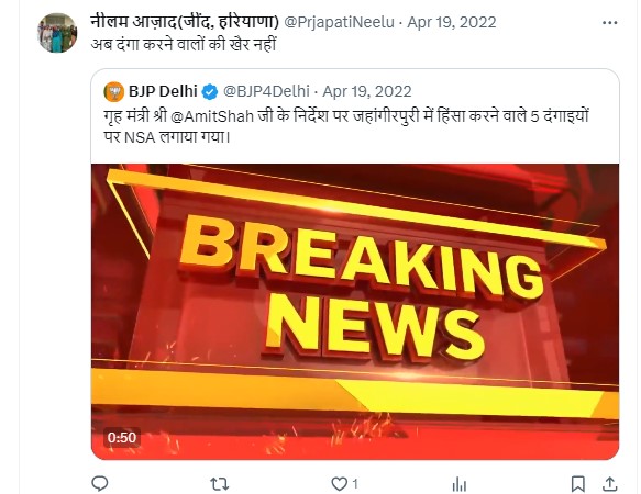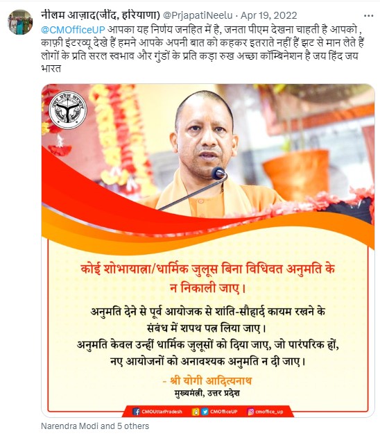 इसके अलावा, हमने यह भी पाया कि उनके नाम से बने X अकाउंट से 2022 में दिल्ली के जहांगीरपुरी में हुई हिंसा के बाद अमित शाह के आदेश पर दंगा करने वालों पर एनएसए लगाए जाने का भी समर्थन किया गया था. इतना ही नहीं, वह अपने एक ट्वीट में उत्तर प्रदेश के मुख्यमंत्री योगी आदित्यनाथ को लेकर यह भी लिख चुकी हैं कि “जनता आपको पीएम देखना चाहती है”.