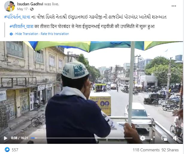 इसके बाद हमने फेसबुक पर गुजराती कीवर्ड की मदद से सर्च किया। हमें इसुदान गढ़वी के फेसबुक पेज पर 17 मई 2022 को अपलोड किया गया लाइव वीडियो मिला। इसमें भी वायरल वीडियो का लंबा वर्जन देखा जा सकता है। वीडियो पोरबंदर में आयोजित परिवर्तन यात्रा का है।