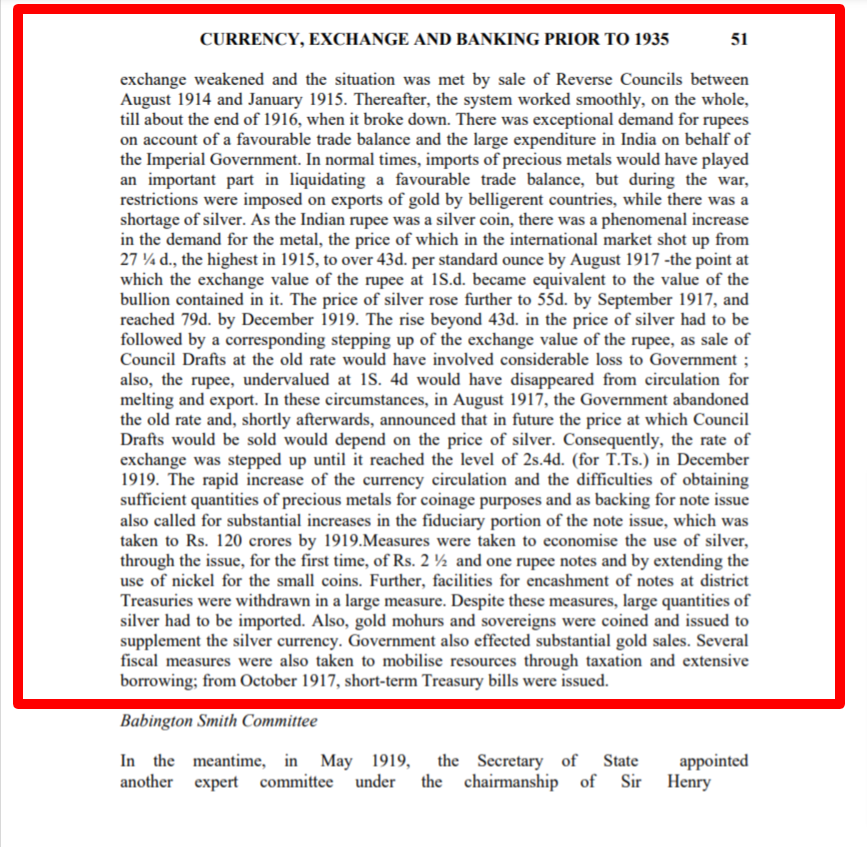RBI द्वारा प्रकाशित उक्त लेख के अनुसार, प्रथम विश्वयुद्ध के दौरान 1915 में सिक्कों के धातु की कीमत 27 ¼ d थी जो कि 1917 के अगस्त महीने में बढ़कर 43d हो गई. 1917 में धातुओं, विशेषकर चांदी की इतनी किल्लत हो गई थी कि 1Sd (S=शिलिंग d=पैसे) भारतीय रुपये की कीमत उसे बनाने में प्रयुक्त धातु की कीमत के बराबर हो गई थी. इसके बाद 1917 के सितंबर महीने में चांदी की कीमत 55d हो गई तथा 1919 के दिसंबर माह में चांदी की कीमत 79d हो चुकी थी.