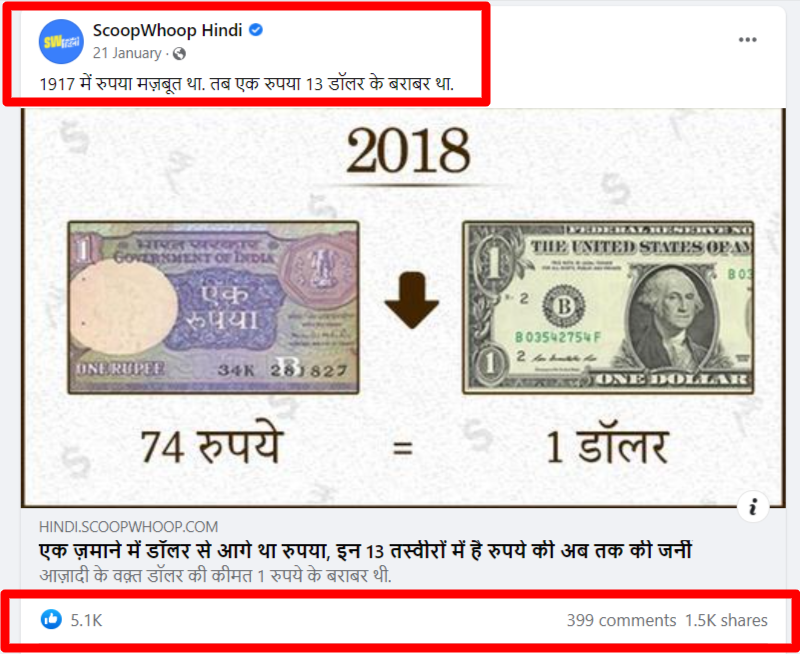 इसी क्रम में सोशल मीडिया यूजर्स द्वारा एक तस्वीर शेयर कर यह दावा किया गया कि 1917 में 1 रुपये की कीमत 13 अमेरिकी डॉलर के बराबर थी.