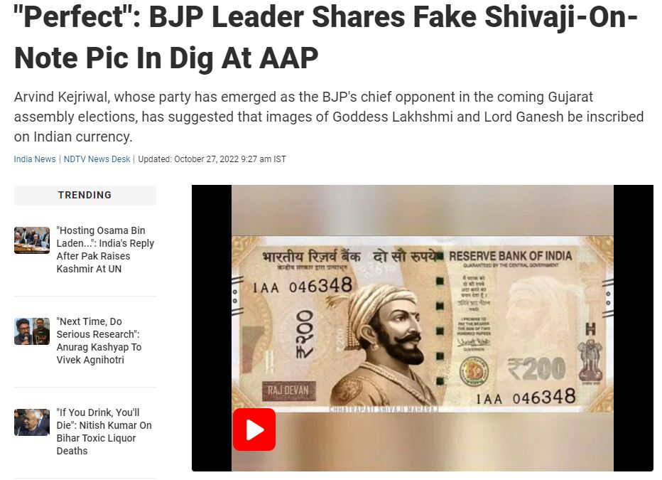 दावे की सत्यता जानने के लिए हमने कुछ कीवर्ड्स की मदद से गूगल सर्च किया। हमें एनडीटीवी की वेबसाइट पर अक्टूबर 2022 में छपी एक रिपोर्ट मिली। रिपोर्ट के अनुसार, महाराष्ट्र से बीजेपी के विधायक नितेश राणे ने शिवाजी महाराज की फोटो को नोट पर छापे जाने का सुझाव दिया था। राणे ने 200 रुपये की एक एडिटेड तस्वीर साझा की थी, जिसमें छत्रपति शिवाजी महाराज की फोटो लगी थी। रिपोर्ट में बताया गया है कि दिल्ली के मुख्यमंंत्री अरविंद केजरीवाल द्वारा नोटों पर गणेश-लक्ष्मी की फोटो छापे जाने के मुद्दे के बीच उन्होंने ये तस्वीर साझा की थी।