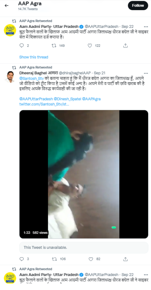 वायरल दावे के बारे में अधिक जानकारी के लिए हमने आम आदमी पार्टी की आगरा इकाई के आधिकारिक सोशल मीडिया पेजों का रुख किया. इस प्रक्रिया में हमें AAP Agra द्वारा शेयर किए गए कई ट्वीट्स प्राप्त हुए, जिनमें वायरल दावे को फर्जी बताते हुए पुलिस से शिकायत की बात कही गई है.