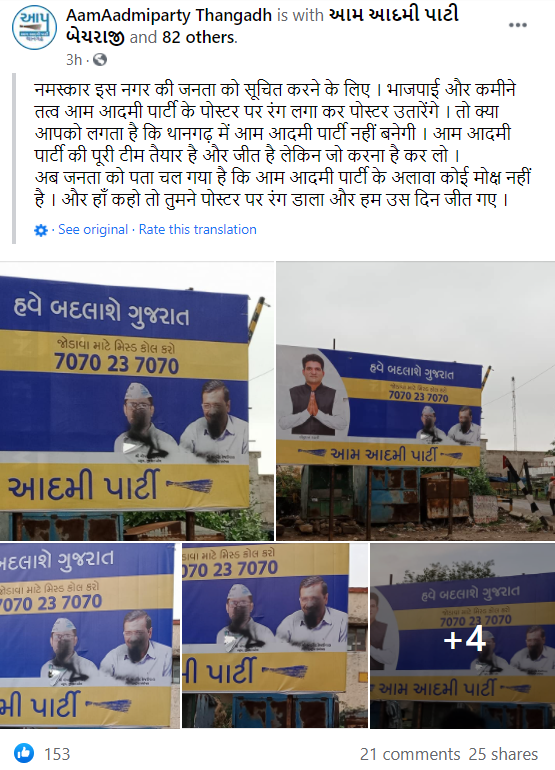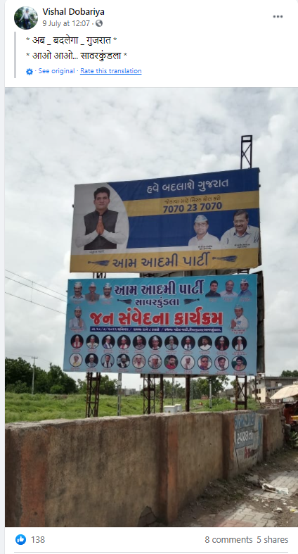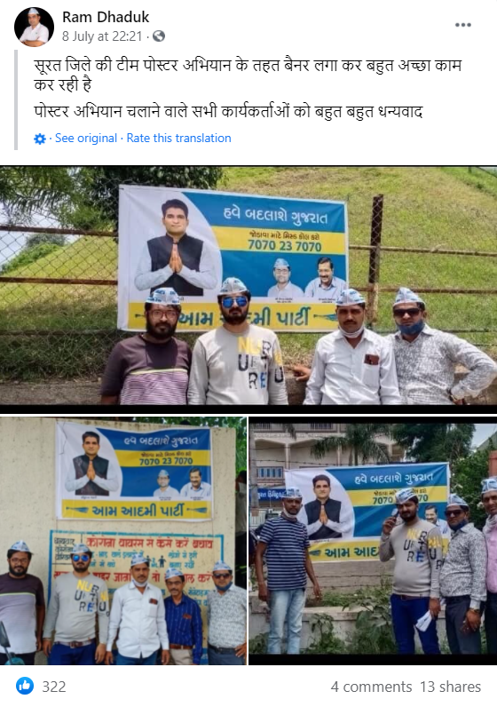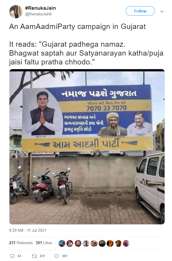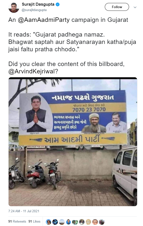इसी क्रम में, भाजपा समर्थक सोशल मीडिया यूजर्स ने एक तस्वीर शेयर कर यह दावा किया कि आम आदमी पार्टी की गुजरात इकाई ने एक होर्डिंग लगवाकर जनता से यह अपील की है कि लोग हिन्दू रीति-रिवाजों का पालन ना कर नमाज पढ़ें.