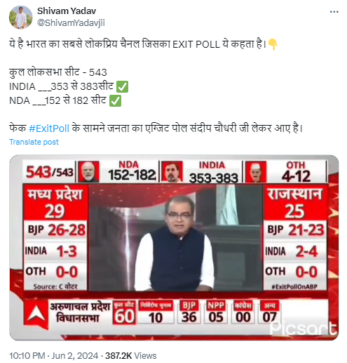 इस वीडियो को वायरल दावे वाले कैप्शन के साथ X पर शेयर किया गया है, जिसमें लिखा हुआ है, “ये है भारत का सबसे लोकप्रिय चैनल जिसका EXIT POLL ये कहता है. कुल लोकसभा सीट – 543. INDIA- 353 से 383सीट. NDA- 152 से 182 सीट. फेक ExitPoll के सामने जनता का एग्जिट पोल संदीप चौधरी जी लेकर आए है”.