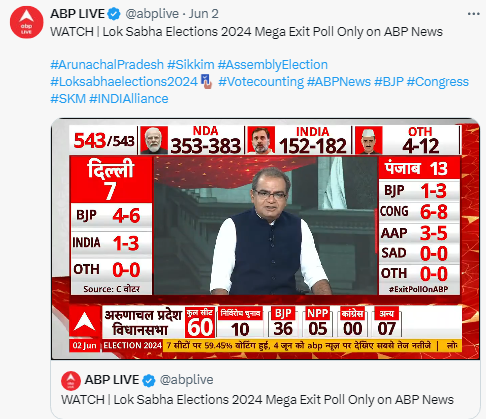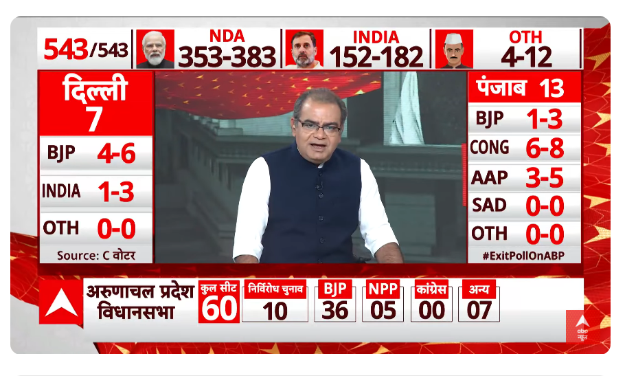 एबीपी न्यूज ने अपने एग्जिट पोल में इंडिया गठबंधन को दी बढ़त.