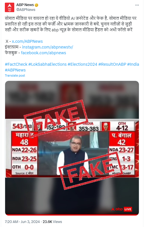 जांच में हमें एबीपी न्यूज द्वारा 3 जून 2024 को किया गया एक ट्वीट भी मिला. जिसमें उन्होंने वायरल वीडियो के एआई जेनरेटेड और फेक होने का दावा किया है. इस दौरान हमने संदीप चौधरी से भी संपर्क किया, तो उन्होंने भी वायरल वीडियो को फर्जी बताया.
