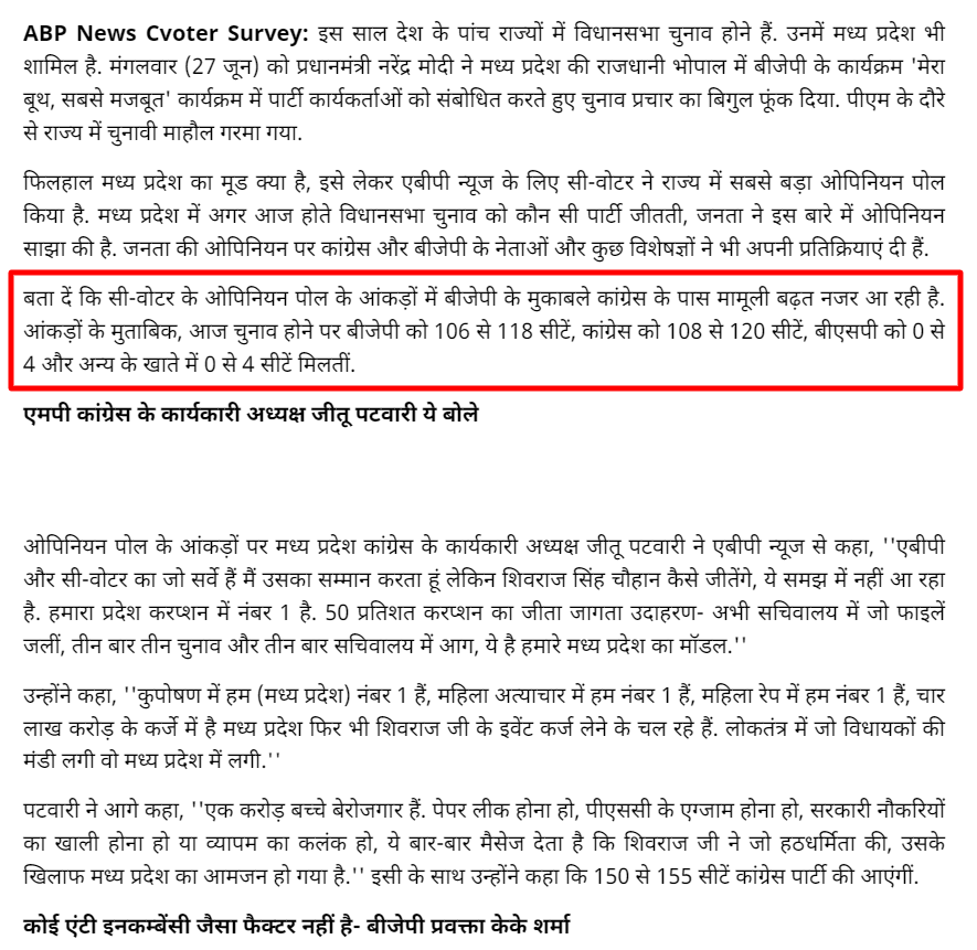 इसके अतिरिक्त, हमें ABP News द्वारा 27 जून, 2023 को प्रकाशित लेख में यह जानकारी मिली कि संस्था ने पोल में बीजेपी को 106 से 118, कांग्रेस को 108 से 120, बीएसपी को 0 से 4 तथा अन्य को में 0 से 4 सीटें दी हैं.