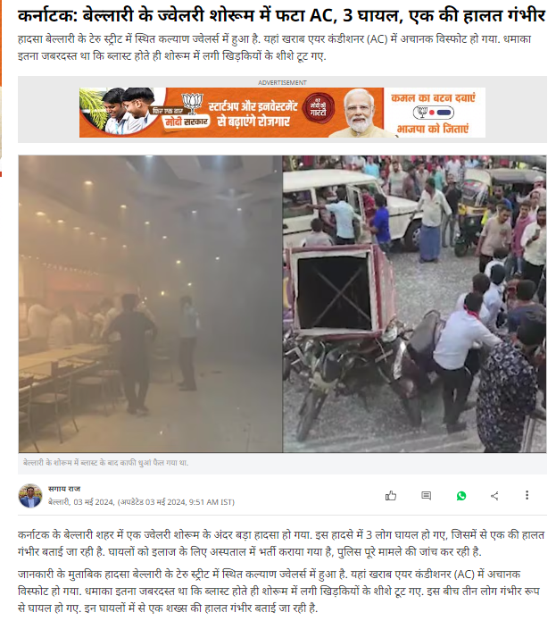‘कल्याण ज्वैलर्स एसी ब्लास्ट बेल्लारी’ कीवर्ड्स को गूगल सर्च करने पर हमें कई रिपोर्ट्स मिलीं, जिन्हें यहाँ और यहाँ देखा जा सकता है। रिपोर्ट्स में बताया गया है कि 2 मई (गुरुवार) को कर्नाटक के बेल्लारी शहर के कल्याण ज्वैलर्स स्टोर के भीतर एयर कंडीशनर में विस्फोट हो गया। इस हादसे में तीन लोग गंभीर रूप से घायल हो गए। यहाँ बताया गया है कि स्टोर में मौजूद एयर कंडीशनर में खराबी के कारण यह विस्फोट हुआ था। यह घटना कथित तौर पर गैस-रिफ्यूलिंग प्रक्रिया के दौरान एयर कंडीशनर के फटने के बाद हुई।