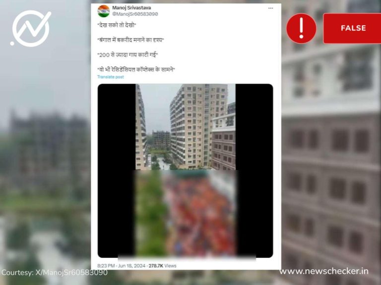 एक वीडियो को शेयर कर सोशल मीडिया यूजर्स ने दावा किया कि बकरीद के दिन पश्चिम बंगाल के एक रेजिडेंशियल काम्प्लेक्स में 200 से ज्यादा गायों की कुर्बानी दी गई। हमारी पड़ताल में यह दावा फर्जी निकला। फैक्ट चेक यहां पढ़ें।