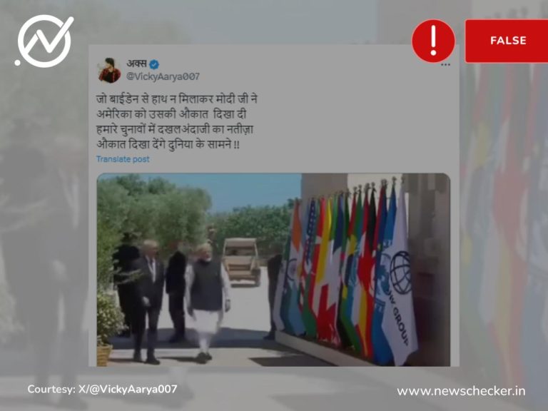 सोशल मीडिया यूजर्स ने दावा किया कि G-7 शिखर सम्मेलन के दौरान पीएम मोदी ने अमेरिकी राष्ट्रपति जो बाइडन के साथ हाथ मिलाने से इनकार कर दिया। हमारी जाँच में यह दावा फर्जी साबित हुआ। फैक्ट चेक यहां पढ़ें।