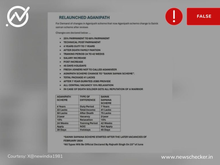 सोशल मीडिया पर एक पोस्ट को शेयर कर दावा किया जाने लगा कि अग्निपथ योजना में सरकार ने बदलाव किया है। हमारी जांच में यह दावा फर्जी निकला। फैक्ट चेक यहां पढ़ें।