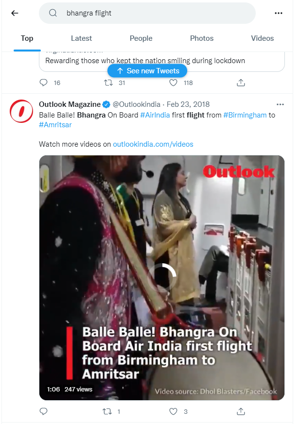 उक्त रिपोर्ट्स से प्राप्त जानकारी के आधार पर ट्विटर एडवांस्ड सर्च टूल की सहायता से किये गए सर्च में हमें कई ऐसी तस्वीरें तथा वीडियो प्राप्त हुए, जिनसे इस बात की तस्दीक हो जाती है कि वायरल वीडियो 2018 में एयर इंडिया ने अमृतसर और बर्मिंघम के बीच नॉट स्टॉप फ्लाइट चालू होने के बाद फ्लाइट में भांगड़ा होने का है.