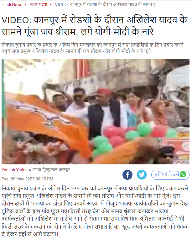 हिन्दुस्तान द्वारा 9 मई 2023 को प्रकाशित लेख के अनुसार, निकाय चुनाव के दौरान सपा प्रत्याशियों के प्रचार के लिए कानपुर पहुँचे सपा प्रमुख अखिलेश यादव जब रोड शो कर रहे थे, उसी समय वहां से सतीश महाना की अगुवाई में निकाला गया रोड शो भी गुजर रहा था. इस दौरान भाजपा समर्थकों ने अखिलेश यादव के सामने भाजपा का झंडा लहराया तथा जय श्रीराम और योगी-मोदी के नारे भी लगाए. दैनिक भास्कर, News18 तथा नवभारत टाइम्स द्वारा प्रकाशित लेखों में भी यही जानकारी दी गई है.