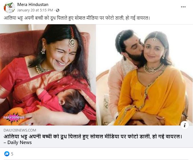 सोशल मीडिया पर एक तस्वीर शेयर कर दावा किया जा रहा है कि अभिनेत्री आलिया भट्ट अपने बच्चे को दूध पिला रही हैं।