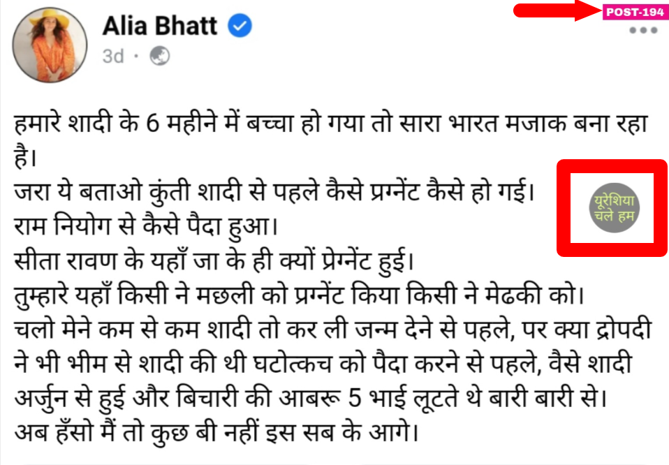 बॉलीवुड अभिनेत्री आलिया भट्ट द्वारा एक पोस्ट शेयर कर हिन्दू देवी-देवताओं का अपमान करने के नाम पर शेयर किए जा रहे इस दावे की पड़ताल के लिए हमने आलिया भट्ट का फेसबुक पेज खंगाला. हालांकि, उनके फेसबुक पेज पर हमें ऐसा कोई पोस्ट प्राप्त नहीं हुआ. बता दें कि वायरल तस्वीर पर ‘यूरेशिया चले हम’ तथा ‘POST-194’ लिखा हुआ है.