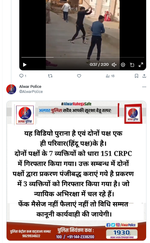 अलवर पुलिस ने ट्वीट करते हुए लिखा था कि “यह वीडियो पुराना है एवं दोनों पक्ष एक ही परिवार हिंदू पक्ष के हैं. दोनों पक्षों के 7 व्यक्तियों को धारा 151 CRPC में गिरफ्तार किया गया. उक्त सम्बन्ध में दोनों पक्षों द्वारा प्रकरण पंजीबद्ध कराए गए हैं. इस प्रकरण में 3 व्यक्तियों को गिरफ्तार किया गया है. जो न्यायिक अभिरक्षा में चल रहे हैं.”