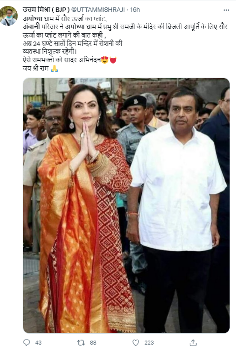 भारत के सबसे अमीर उद्योगपति और रिलायंंस इंडस्ट्रीज के मालिक मुकेश अंबानी समाजसेवी कार्यों और मंदिरों में दान करने को लेकर अक्सर चर्चा में रहते हैं। इंडिया टुडे की वेबसाइट द लल्लनटॉप की एक खबर के मुताबिक, पिछले साल मुकेश अंबानी की कंपनी रिलायंस इडस्ट्रीज ने असम स्थित कामाख्या मंदिर में 19 किलों सोना दान किया था। यूपी में विधानसभा चुनाव की तैयारियों के बीच अयोध्या में भव्य राम मंदिर निर्माण कार्य भी तेजी से चल रहा है। ऐसी उम्मीद जताई जा रही है कि इस महीने अयोध्या में राम मंदिर के राफ्टिंग का कार्य पूरा हो जाएगा और फरवरी से मंदिर निर्माण के लिए पत्थरों को लगाने का कार्य भी शुरू किया जाएगा। इसी बीच सोशल मीडिया पर एक तस्वीर शेयर कर दावा किया जा रहा है कि अंबानी परिवार ने अयोध्या में सौर उर्जा प्लांट लगाने का ऐलान किया है।