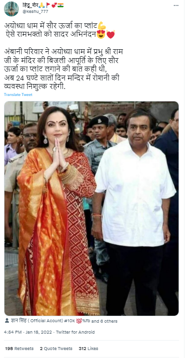 वहीं एक अन्य यूजर ने वायरल दावा शेयर करते हुए लिखा, “अयोध्या धाम में सौर ऊर्जा का प्लांट, अंबानी परिवार ने अयोध्या धाम में प्रभु श्री रामजी के मंदिर की बिजली आपूर्ति के लिए सौर ऊर्जा का प्लांट लगाने की बात कही, अब 24 घण्टे सातों दिन मन्दिर में रोशनी की व्यवस्था निशुल्क रहेगी। ऐसे रामभक्तो को सादर अभिनंदन.”