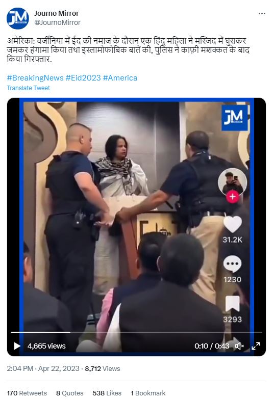 अमेरिका के वर्जीनिया में ईद की नमाज के दौरान एक हिंदू महिला ने मस्जिद में घुसकर जमकर हंगामा किया।