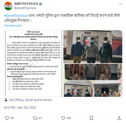 Tweet by Amethi Police on 29th Dec 2021