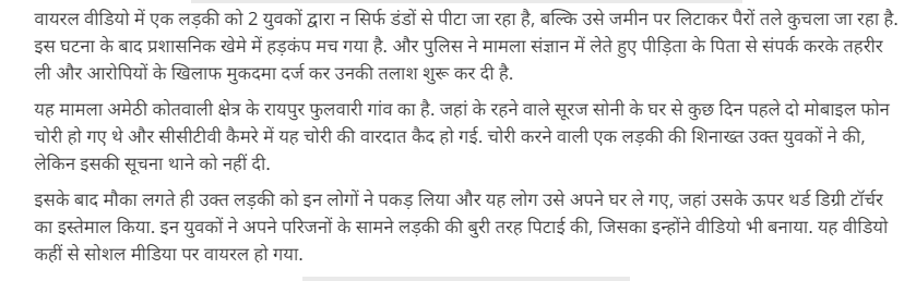 जांच में हमें इस मामले को लेकर आजतक की वेबसाइट पर 28 दिसंबर को प्रकाशित रिपोर्ट मिली. इस रिपोर्ट में बताया गया है कि यह मामला अमेठी कोतवाली थाना क्षेत्र के रायपुर फुलवारी गांव का है. इस गांव के रहने वाले सूरज सोनी के घर से कुछ समय पहले मोबाइल फोन चोरी हुए थे. चोरी की यह वारदात सीसीटीवी में कैद हो गई थी. बाद में कुछ युवकों ने उक्त लड़की की शिनाख्त की और उसको पकड़ कर अपने घर ले गए. इस दौरान उक्त युवकों ने लड़की को बेरहमी से पीटा और इसका वीडियो बना लिया.