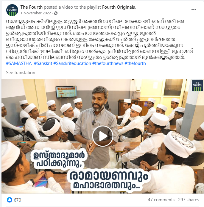साथ ही हमने पाया कि इस खबर पर कई सकारात्मक मीडिया रिपोर्ट्स भी छपी हैं। इनमें से कुछ रिपोर्ट्स को यहाँ, यहाँ और यहाँ पढ़ा जा सकता है। 13 नवंबर, 2022 को नवभारत टाइम्स ने लिखा था कि “केरल के इस इस्लामिक संस्थान में मुस्लिम छात्रों को पढ़ाई जाती है गीता, वेद, उपनिषद, संस्कृत में ही होती है बात।” 13 नवंबर 2022 को ही ‘द प्रिंट’ (The Print) ने लिखा था “केरल के इस्लामिक संस्थान ने संस्कृत पढ़ाकर कायम की मिसाल!”