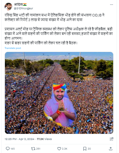 3 अप्रैल 2024 को किये गए एक एक्स पोस्ट में भीड़ की एक तस्वीर के बीच में रविंद्र सिंह भाटी की हाथ जोड़े तस्वीर शेयर की गयी है। पोस्ट के कैप्शन में लिखा है कि ”रविन्द्र सिंह भाटी की नामांकन सभा में ऐतिहासिक भीड़ होने की संभावना CID, IB ने कलेक्टर को रिपोर्ट, 3 लाख से ज्यादा संख्या में भीड़ आने का दावा। प्रशासन अलर्ट मोड पर, ट्रैफिक व्यवस्था को लेकर पुलिस अधीक्षक ले रहे है फीडबैक। बड़ी संख्या में आने वाले वाहनो की पार्किंग को लेकर बन रही समस्या, हजारों संख्या में वाहनों का होगा आगमन। शहर से बाहर वाहनों की पार्किंग को लेकर चल रही है बैठक।”