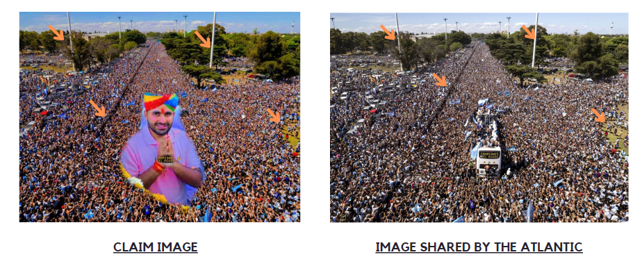 जांच की शुरुआत में हमने इस तस्वीर को रिवर्स इमेज सर्च किया। इसके परिणाम में हमें 21 दिसंबर 2022 को ‘द अटलांटिक’ द्वारा प्रकाशित रिपोर्ट में ऐसी ही तस्वीर नज़र आती है। रिपोर्ट में बताया गया है कि यह तस्वीर अर्जेंटीना द्वारा फुटबॉल विश्व कप जीतने के बाद मनाये जा रहे जश्न के दौरान की है।