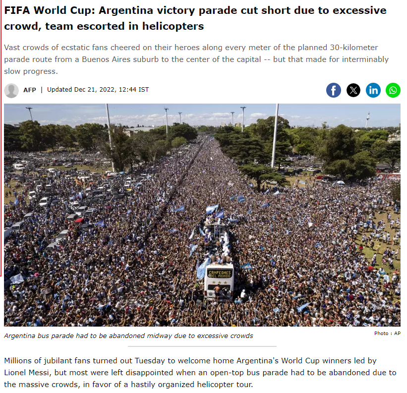 Times Now द्वारा 21 दिसंबर 2022 में इस तस्वीर के बीच में बस के साथ प्रकाशित रिपोर्ट में भी बताया गया है कि, यह फीफा वर्ल्ड कप में अर्जेंटीना की जीत के बाद हुई विक्ट्री परेड की तस्वीर है।