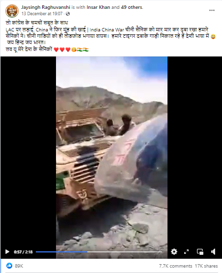 वीडियो के साथ फेसबुक और ट्विटर यूजर्स कैप्शन में लिख रहे हैं, “अब मेरा देश नहीं झुकेगा…हर घुसपैठिया ठुकेगा…भारत माता के शेर Indian Army के जवानों ने #ArunachalPradesh के #Tawang में Chinese आर्मी के 300 घुसपैठियों को दौड़ा-दौड़ा कर भगाया…Salute to the Indian Army 🇮🇳भारत माता की जय”.